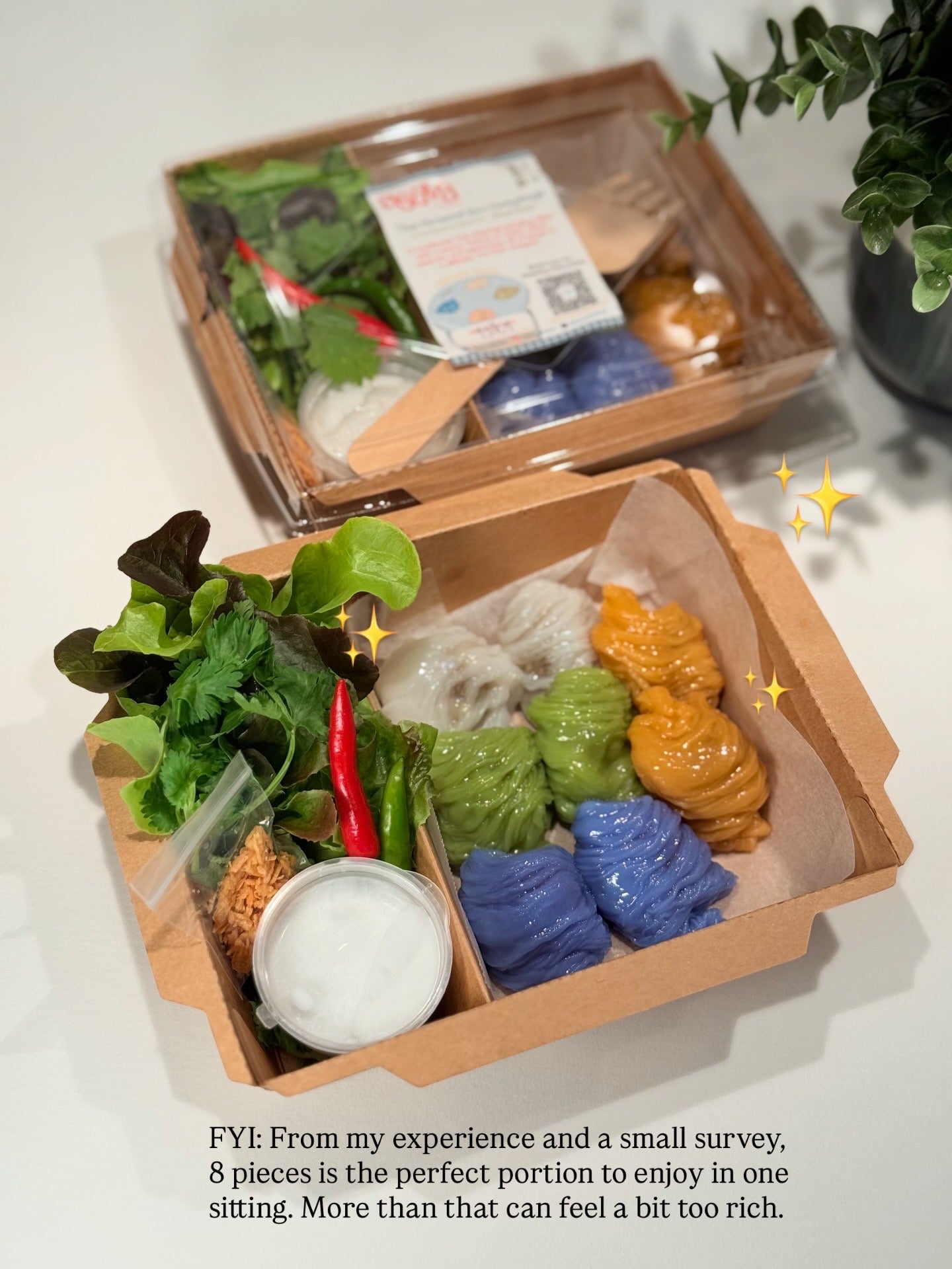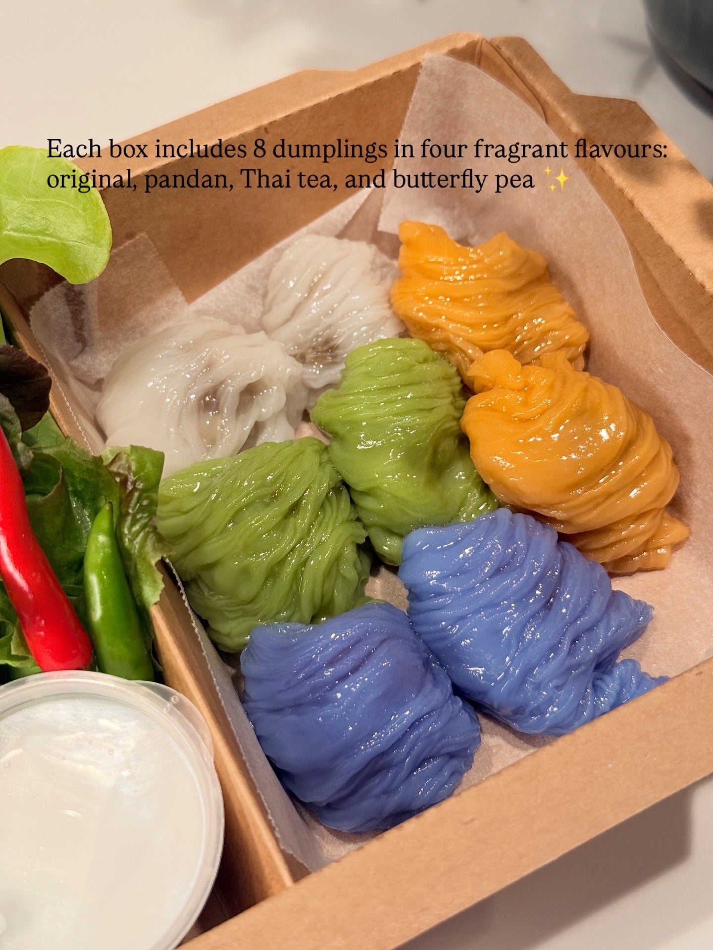 - 8 dumplings (4 flavours: original, pandan, butterfly pea, and Thai tea)